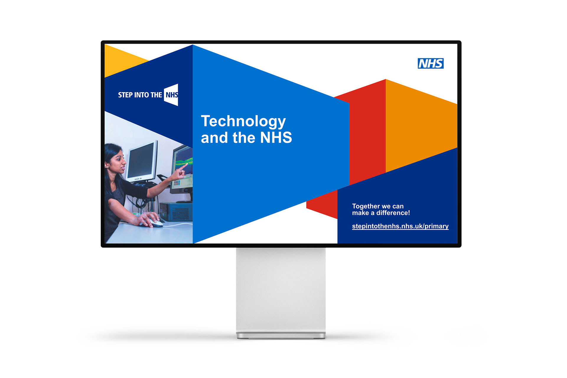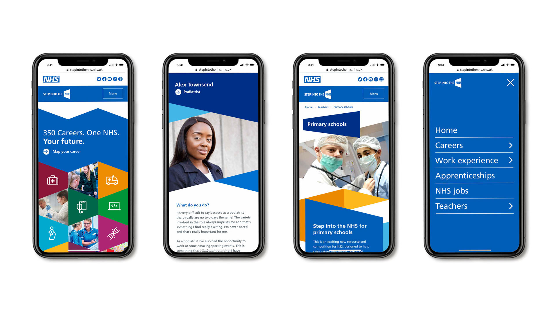 Using the familiar NHS blue “lozenge” as a starting point, an open-door metaphor was created. It invites children and young people to step through it to learn about health care careers.
