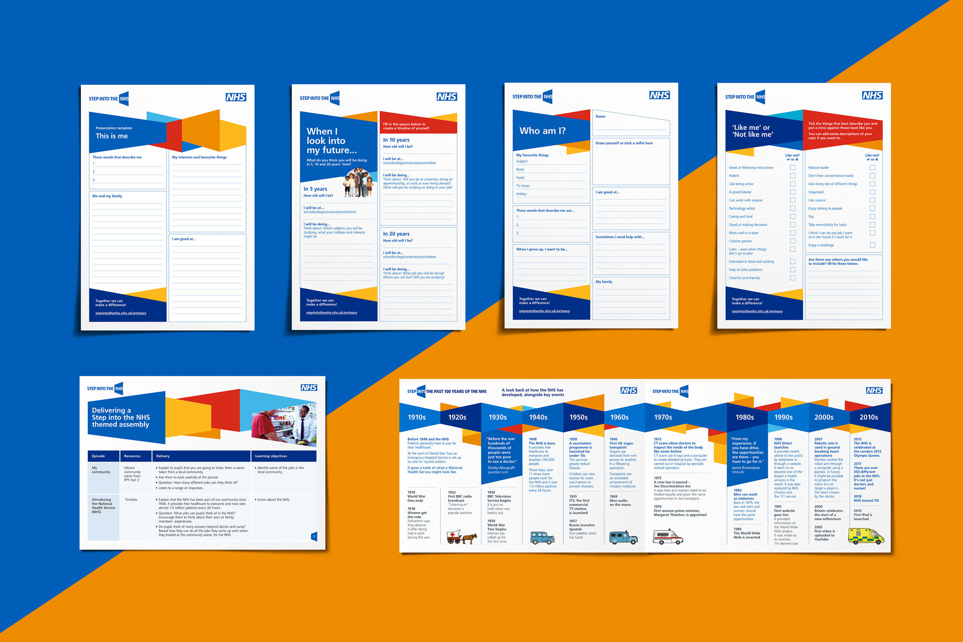 The shape of the door is a trapezium. It is applied as a signature pattern and a holding device for colour, image and written content. The colour palette, drawn from the NHS brand identity colours, differentiates material targeted at primary Key Stage 2 and secondary Key Stages 3 and 4.