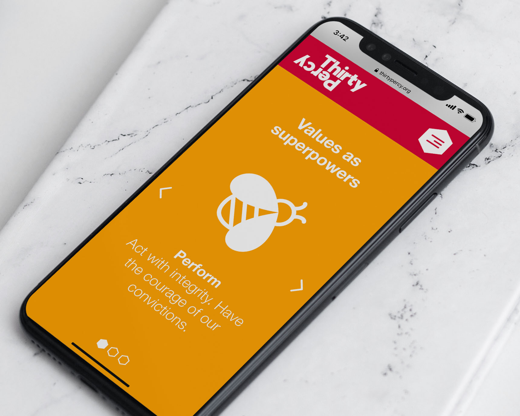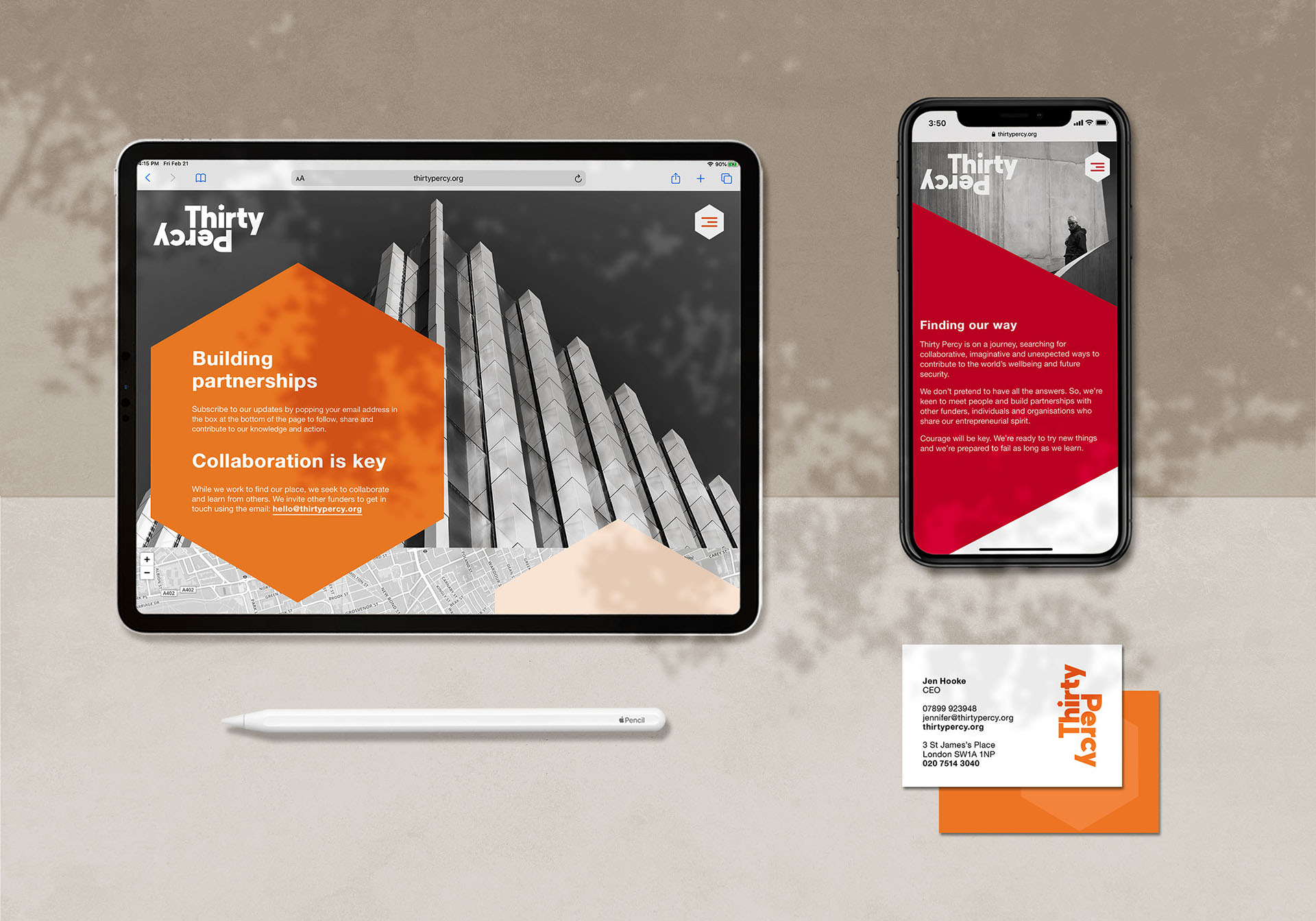 This approach inspired the branding, based on the hexagonal cells of honeycomb, which had also inspired the interior of their new offices, 30 Percy Street, soon to be the foundation’s new home. The address’s lovely alliteration, Thirty Percy, became the foundation’s name.